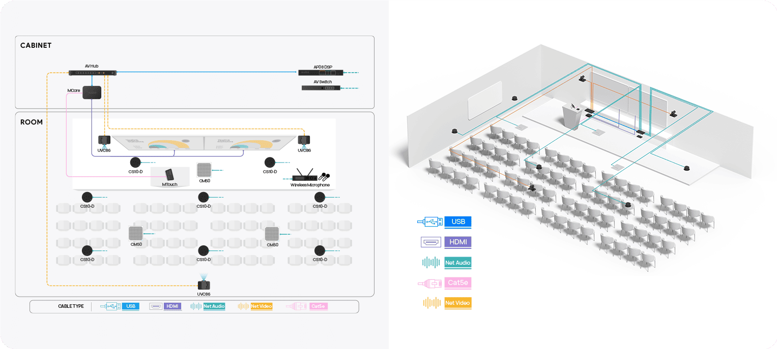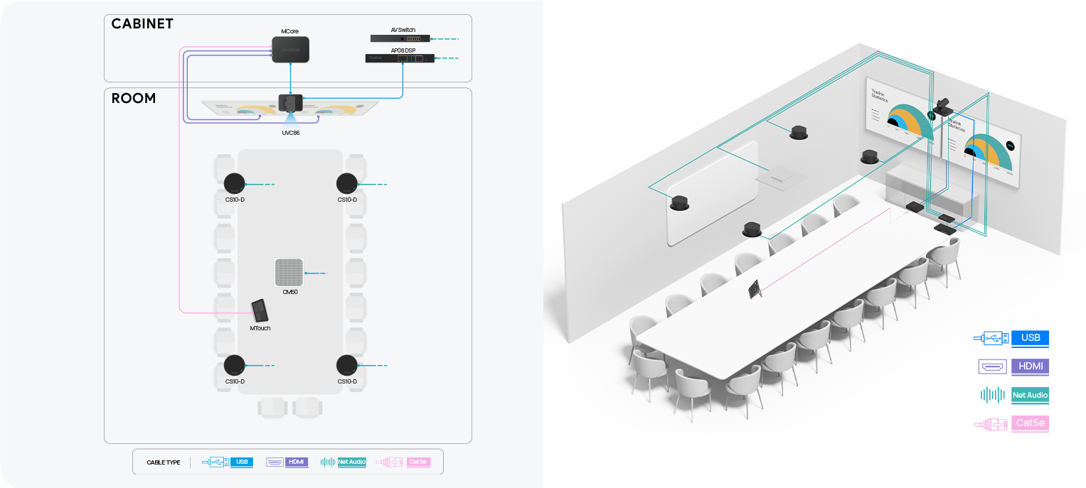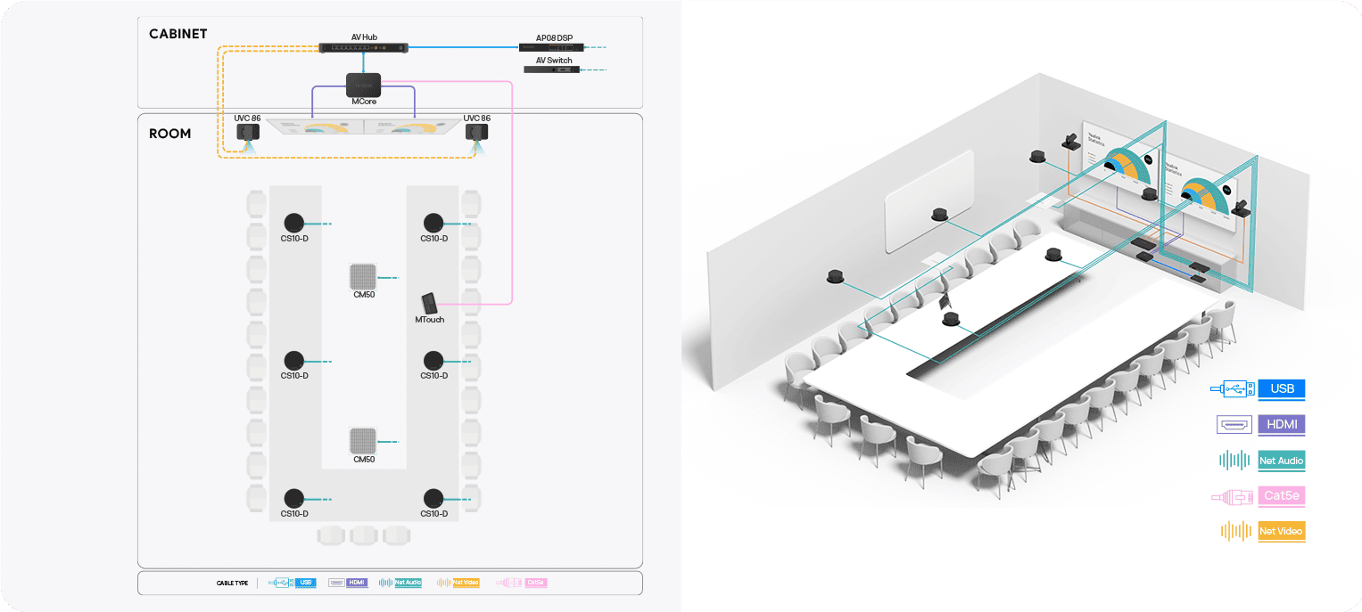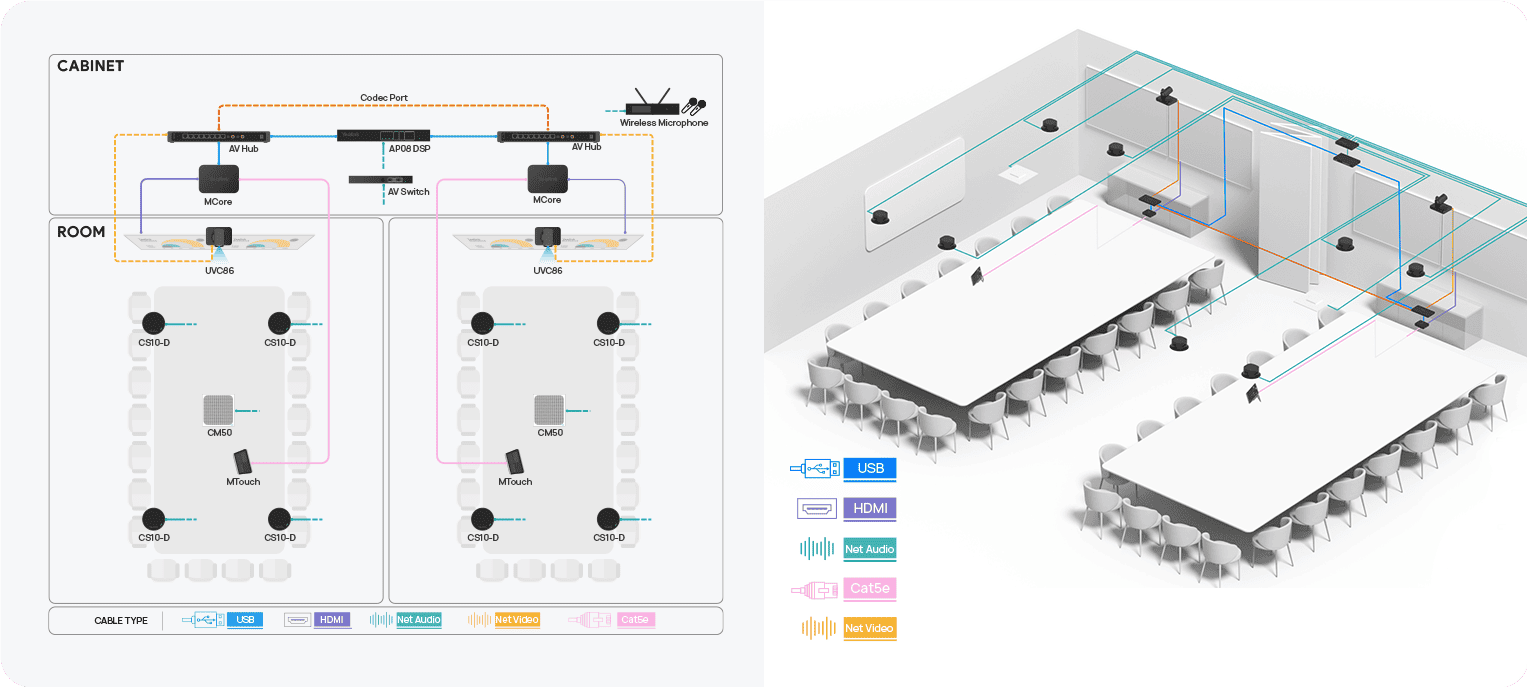 Phòng họp lớn, với sức chứa lên đến 16 người, thường được sử dụng cho các cuộc họp chiến lược, hội nghị với khách hàng hoặc thuyết trình quan trọng. Với không gian lớn hơn, đòi hỏi sự phối hợp của nhiều thành viên và tương tác nhiều chiều, âm thanh cần mạnh mẽ – ổn định – thông minh hơn.