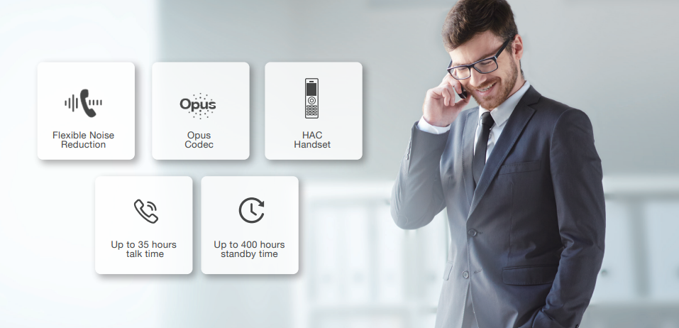 - Thiết bị DECT chuyên dụng cho phép roaming liền mạch giữa nhiều trạm phát.