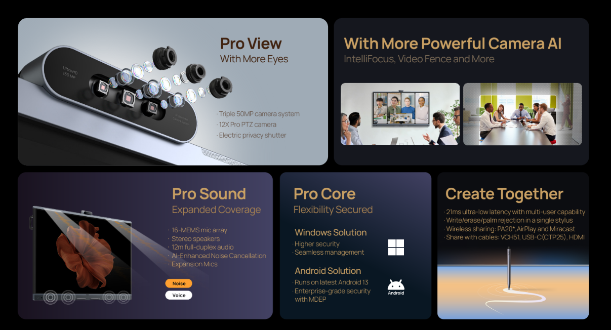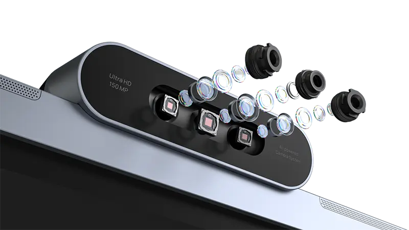 Điểm nhấn của MeetingBoard Pro là hệ thống ba camera (Triple-eye Camera System), mỗi camera có độ phân giải lên đến 50MP. Hệ thống này bao gồm một camera góc rộng (sử dụng cảm biến Sony 1/1.56″) và hai camera tele (sử dụng cảm biến Sony 1/2″), cho phép thu hình ở nhiều tiêu cự khác nhau với độ chi tiết cao. Ống kính chuyên nghiệp đảm bảo hình ảnh có độ nhiễu thấp, màu sắc tự nhiên và chất lượng HD, ngay cả trong điều kiện ánh sáng phức tạp.
